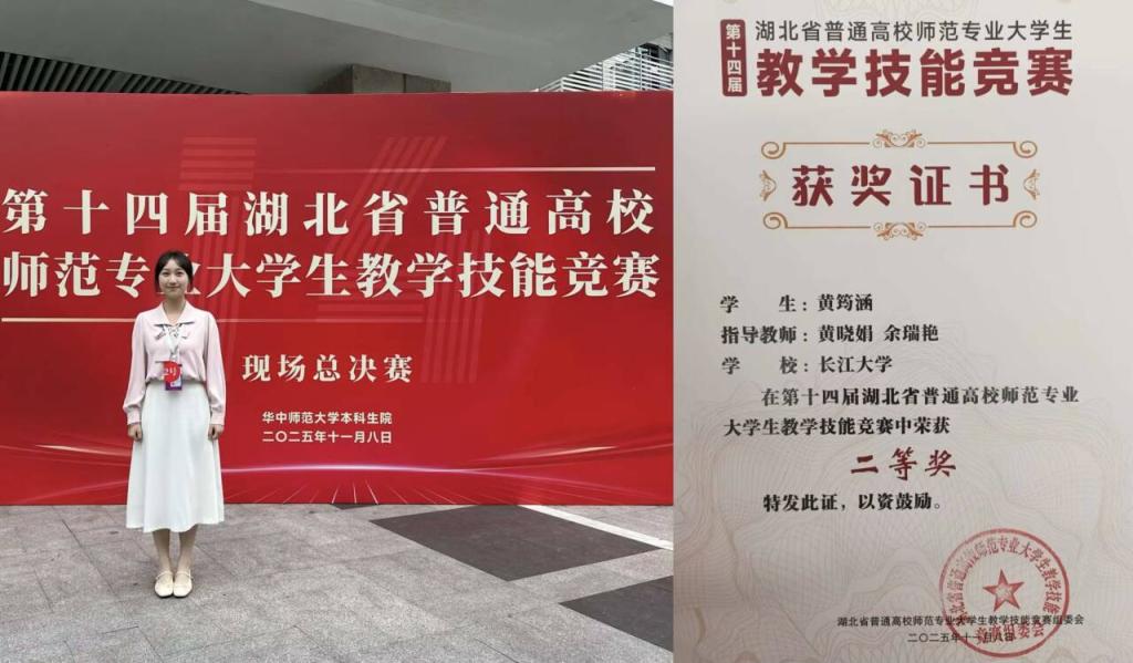 (通讯员 周鹂)近日,湖北省第十四届师范专业大学生教学技能大赛结果揭晓,我院黄筠涵同学凭借过硬的专业素养和出色的现场发挥,在激烈角逐中勇夺初中数学组二等奖。
