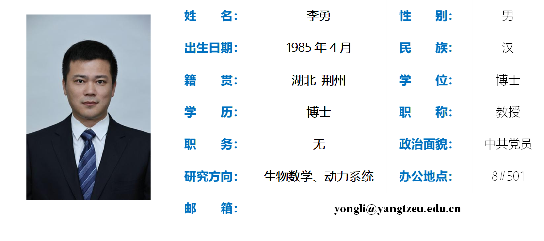 李勇,长江大学信息与数学学院教授,硕士生导师,2014年6月于华中师范大学数学与统计学学院获得理学博士学位,2015年12月-2018年12月在西南大学数学博士后科研流动站从事科学研究工作,2014年6月起任职于长江大学信息与数学学院,长江大学第三批“菁英人才”。研究方向为:生物数学、动力系统。以第一或者通讯作者公开发表SCI检索论文 30多篇。主持国家自然科学基金2项,省部级项目4项,横向课题1项,参与国家自然科学基金3项;3项呈阅件\课题获得省部级领导批示。